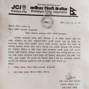कलैया सिटि जेसीजको निर्वाचन कार्यक्रम स्थगित भन्दै निर्वाचन अधिकृत जेसी कुशवाहाले कलैया सिटी जेसीजको ११ औ वार्षिक साधारण सभा तथा शाखा अधिवेशन स्थगित भएको जनाएका छन्। कलैया सिटी जेसीजको ११ औ वार्षिक साधारण सभा तथा शाखा अधिवेशन भईरहदा उम्मेदवारहरु विच आपसी सहमति नहुँदा तथा बैठकको समय समाप्त भई राति परेको हुँदा निर्वाचन कार्यक्रम तत्काल गर्न नसकिएकोले हालको लागि निर्वाचन स्थगित गरिएको तथा निर्वाचनको अर्को समय तोकि निर्वाचन मार्फत नयाँ कार्यसमिति चयन गरिने कुरा जेसिसका निर्वाचन अधिकृत जेसी कुशवाहाले बताए ।
