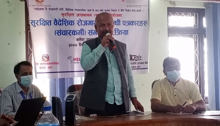 सुरक्षित वैदेशिक रोजगारी सम्बन्धी अन्तरक्रिया कार्यक्रममा कलैया उपमहानगरपालिकाको प्रमुख प्रशासकिय अधिकृत प्रहलाद बर्णवाल र संचारक्रमिहरुको सहभागिता रहेको थियो ।