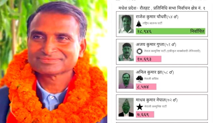 प्रतिनिधि सभा निर्वाचन अन्तर्गत रौतहट निर्वाचन क्षेत्र नं. १ मा राष्ट्रिय स्वतन्त्र पार्टी (रास्वपा) का उम्मेदवार राजेश कुमार चौधरी विजयी हुनुभएको छ।