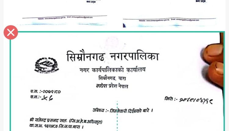सिम्रौनगढ नगरपालिकाले निमित्त प्रशासकीय प्रमुख हरिओम प्रशाद जैसवालको काज फिर्ता गरेका छन। सिम्रौनगढ नपामा नगर प्रमुख किशोरी प्रशाद जैसवालले कानुनी राज्यमा विधिको शासन रहेको कार्य गरि जनतामा प्रष्ट पारेका छन्। आफू खुशी कामगरेको भन्दै निमित्त प्रशासकीय प्रमुख जैसवालको काज नगर प्रमुख जैसवालले फिर्ता गरेका छन् । संघीय मामिला तथा समान्री प्रशासन मन्त्रालय बाट काजमा खटाइएको थिए, तर संतोषजनक कार्य नदेखेकोले जैसवाल लाई दैनिक प्रशानिक कामकाज दिई जेष्ट कर्मचारी बिरेन्द्र प्रसाद साह लाई प्रमुख प्रशासकीय अधिकृतको लागि मन्त्रालयमा सिफारिस गरिएको नगर प्रमुख जैसवालले बताए।