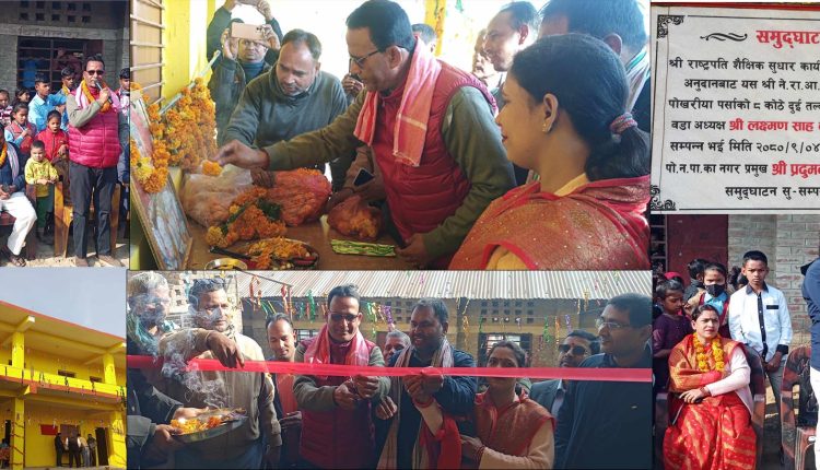 श्री राष्ट्रपति शैक्षिक सुधार कार्यक्रम अंतर्गत बाट ४ कोठे र पोखरिया नगरपालिका वडा नम्बर ४ को अनुदान बाट ४ कोठे गरी ८ कोठे भवनको पोखरिया नगरपालिकाको नगर प्रमुख प्रद्युमन प्रसाद चौहानले माता सरस्वतीको पूजा गरी रिबन काटी