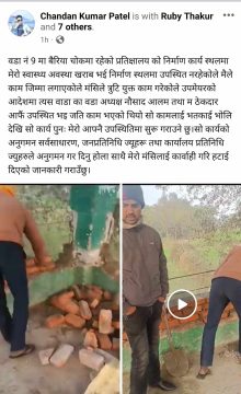काम गुणस्तरहीन भयको विरोध पच्छी ठेकेदार पटेलले सामाजिक संजाल मार्फत मेरो स्वास्थ्य अवस्था खराब भई निर्माण स्थलमा उपस्थित नरहेकोले मैले काम जिम्मा लगाएको मंसिले त्रुटि युक्त काम गरेकोले उपमेयरको आदेशमा त्यस वडाका वडा अध्यक्ष नौसाद आलम तथा म ठेकदार आफैं उपस्थित भइ जति काम भएको थियो सो कामलाई भतकाई भोलि देखि सो कार्य पुनः मेरो आफ्नै उपस्थितिमा सुरू गराउने छु।सो कार्यकोअनुगमन सर्वसाधारण, जनप्रतिनिधि ज्यूहरू तथा कार्यालय प्रतिनिधि ज्युहरुले अनुगमन गर दिनु होला साथै मेरो मंसिलाई कार्वाही गरि हटाई दिएको जानकारी गराउँछु।