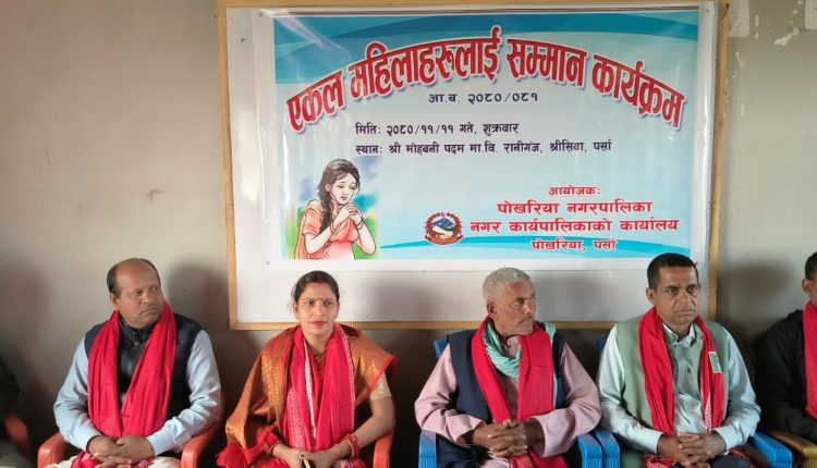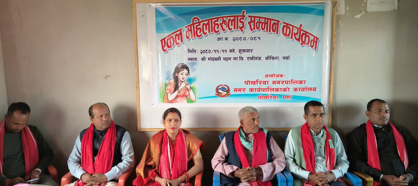 को पोखरिया नगरपालिकामा रहेका ७० जना एकल महिला लाई नगरपालिकाले एक कार्यक्रमको बिच समान गरेको छ।