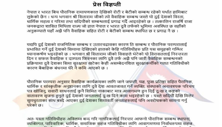 यद्यपि दुई देशको राजनितिक सम्बन्ध र उतारचढावका कारण ति सम्बन्ध र पौरानिक परम्परालाई प्रभावित गर्ने दुई देशको सिमामा देखिएको हालको केहि गतिविधीहरु प्रति यस समुहको गम्भिर ध्यानाकर्षण भइरहेको जनाएका छन् । भगवान श्री सिताराम जीको विवाहले भेटेको यो विरासत लाई निरन्तरता दिन र सफल वैवाहिक र दाम्पत्य जिवनका लागि दुवै तर्फ अझै पनि जारी वैवाहिक सम्बन्धनको प्रक्रियामा दुवै देशका सिमा सुरक्षामा खटेका केही असम्बेदनशिल सुरक्षाकर्मीको गलत गतिविधीको कारण बैबाहिक बंधनमा धेरै नै कमि आएको विज्ञयप्तिमा उल्लेख गरिएको छ ।