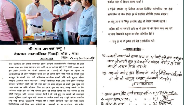 ज्ञापन कर्ताहरु वार्ड अध्यक्ष अरुण कुमार सिंह, नबन कुमार यादव, सुरेश प्र. साह, संजय कुमार, सत्येन्द्र प्र. यादव लगायतकाले ज्ञापनपत्र दिदै जिल्ला प्रशाषन कार्यालय बारा (कलैया) लाई बोधार्थ गरेका छन्।
