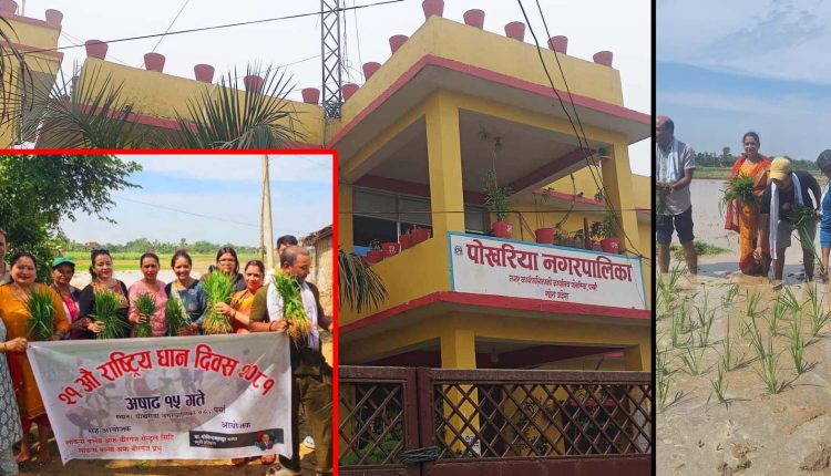 को पोखरिया नगरपालीकाको वडा नम्बर ८ जगतपुरमा आज एक कार्यक्रमको बिच वडा अधयक्ष किसोरी साह तेलीको अधयक्ष्ता तथा ड० गोबिन्द बहादुर थापा स्मृती प्रतिष्ठानको ओजनामा २१ औ राष्ट्रिय धान दिवस २०८१ असाढ १५ खेत मा धान रोपाइ सहित दही चिउरा तथा आप खुवाएर मनाईएको धान रोपाई कार्यक्रम सम्पन भएको वडा अध्यक्ष किसोरी साहले जानकारी दिए ।