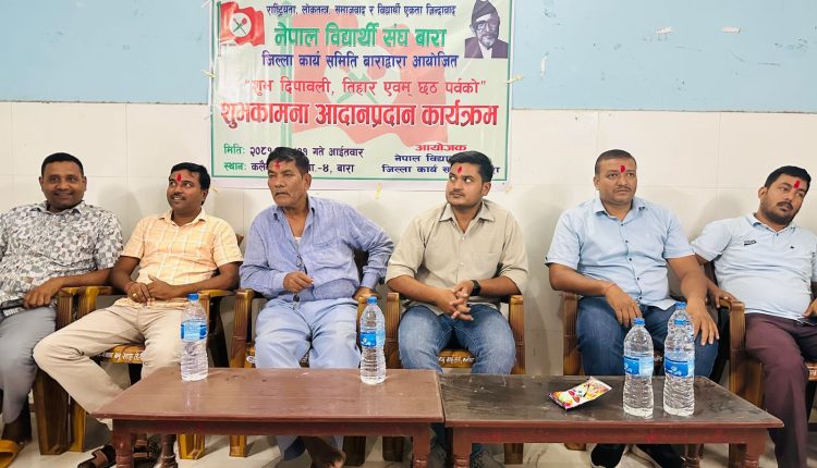 नेपाल विद्यार्थी संघ बाराले शुभ दिपावली, तिहार र छठ पर्वको शुभ अवसरमा आयोजना गरेको शुभकामना आदानप्रदान कार्यक्रम जिल्ला अध्यक्ष प्रवीण पटेलको अध्यक्षता तथा नेपाली कांग्रेस पार्टी बाराका जिल्ला सचिव राजेश रौनियारको प्रमुख आतिथ्यतामा भएको थियो।