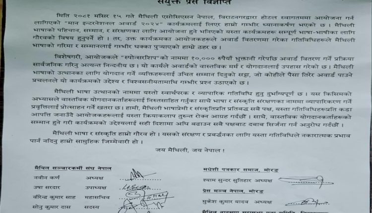 मैथिली भाषाको संरक्षण र सम्मानका लागि सञ्चालन गरिने भनिएको कार्यक्रम “मान इन्टरनेशनल अवार्ड २०२४” विवादमा परेको छ। मैथिली एसोसिएसन नेपालद्वारा होटल स्वागतममा आयोजना गरिन लागेको यस कार्यक्रममा अवार्ड वितरणका लागि गरिएको कार्यशैलीले मैथिली भाषाको गरिमा र पहिचानमाथि गम्भीर प्रश्न खडा भएको छ।