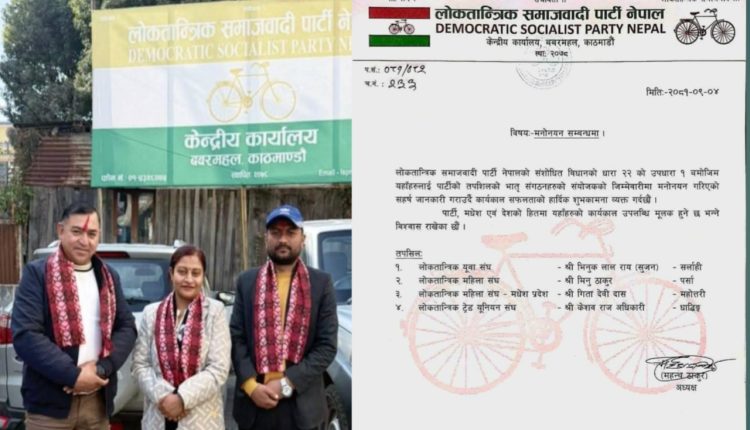 लोसपा नेपाल लाई अब्बल तथा सब्बल बनाउन केहि पार्टी प्रतिनिधिहरु लाई सम्मान सहित पदभार बढाउदै मनोनीत गरेका छन्। लोकतान्त्रिक समाजवादी पार्टी नेपालका केन्द्रीय अध्यक्ष मा.महन्थ ठाकुरले लोकतान्त्रिक यूवा संघको संयोजक पदमा भिनुक लाल राय (सुजन), लोकतान्त्रिक महिला संघको संयोजक पदमा मिनु ठाकुर, लोकतान्त्रिक ट्रेेड युनियन महासंघको संयोजक पदमा केशव अधिकरी लाई मनोनयन गरिएको पत्र आज विधिवतरूपमा बुझी पदभार ग्रहण गरेका छन्।
