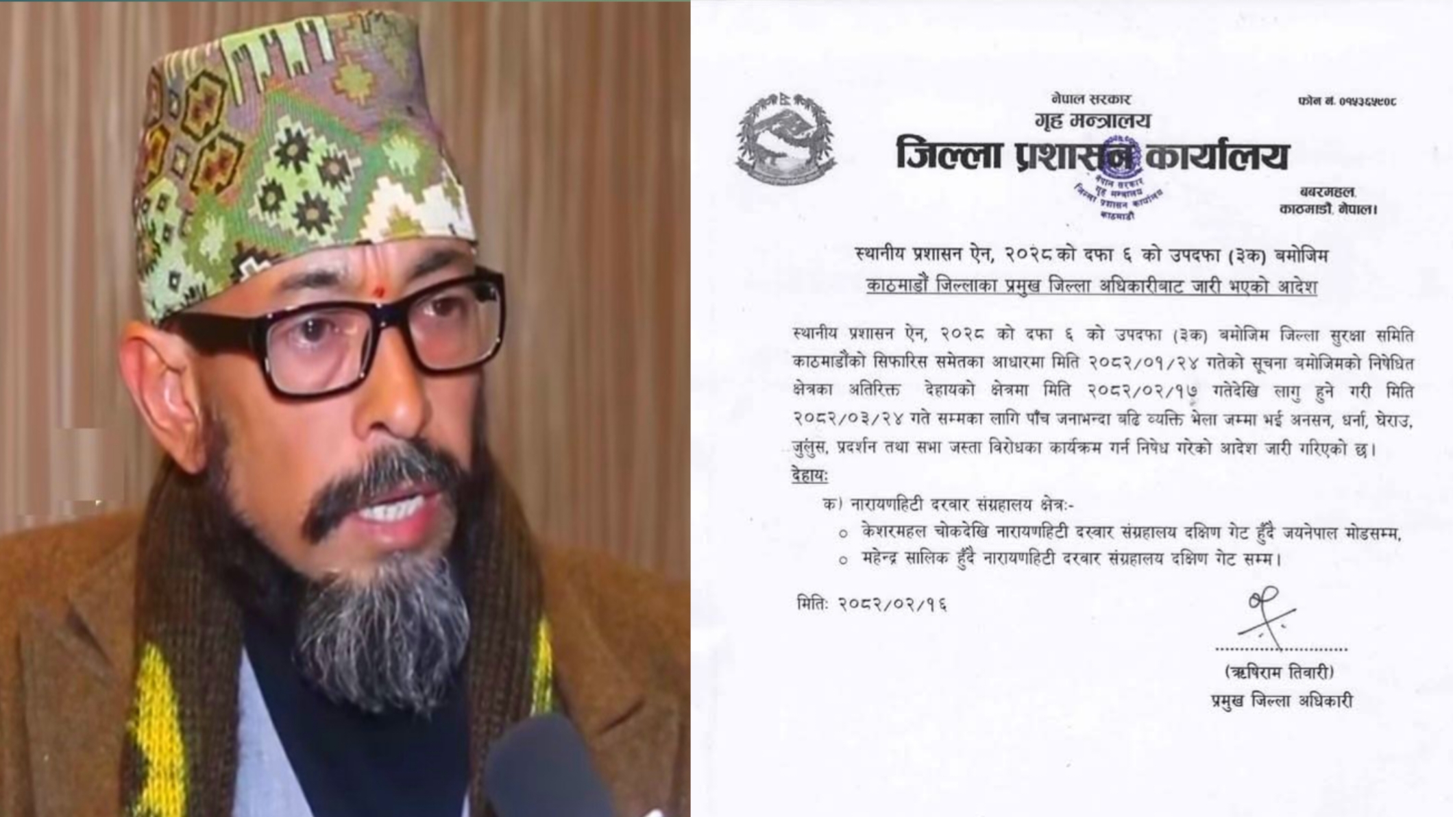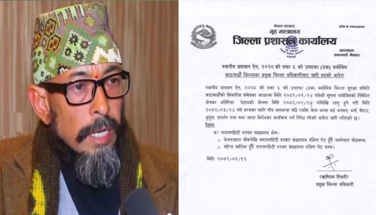 आफ्नै देशको जनताका लागि आतंककारी जस्तो व्यवहार गर्दै स्थानीय प्रशासन ऐन, २०२८ को दफा ६ को उपदफा (३क) बमोजिम जिल्ला सुरक्षा समिति काठमाडौंको सिफारिस समेतका आधारमा मिति २०८२/०१/२४ गतेको सूचना बमोजिमको निषेधित क्षेत्रका अतिरिक्त देहायको क्षेत्रमा मिति २०८२/०२/१७ गतेदेखि लागु हुने गरी मिति २०८२/०३/२४ गते सम्मका लागि पाँच जनाभन्दा बढि व्यक्ति भेला जम्मा भई अनसन, धर्ना, घेराउ, जुलुस, प्रदर्शन तथा सभा जस्ता विरोधका कार्यक्रम गर्न निषेध गरेको आदेश जारी गरिएको छ।