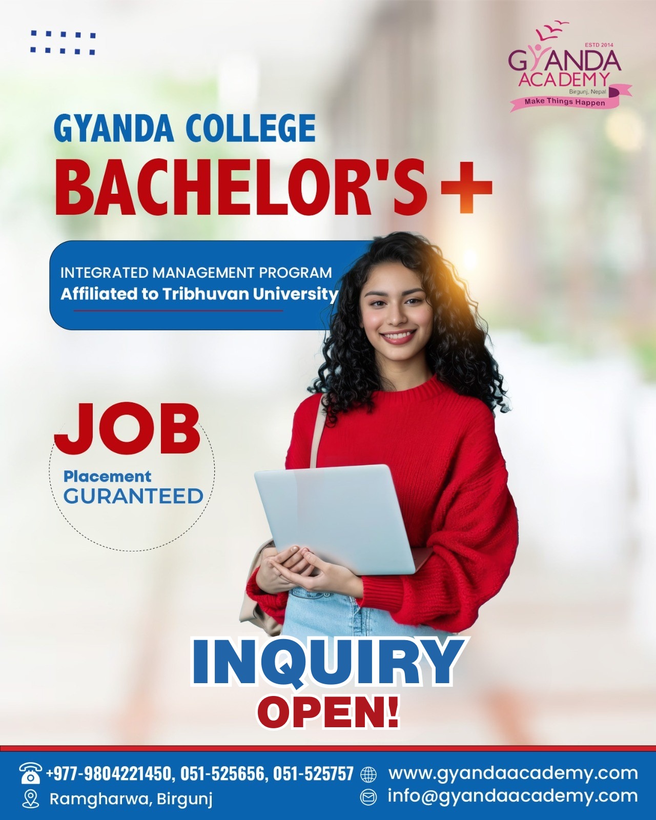 ज्ञान्दाको पाठ्यक्रम देखि खेलकुद सम्म मात्र नभएर हरेक दृष्टिकोणले हरेक विद्यार्थी लाई कितावी ज्ञानका साथै व्यवहारिक ज्ञान समेत दिने गरिएको कोइरालाले बताएका थिए। ज्ञान्दामा नर्सरी देखि प्लस टु भन्दा माथिको पढाइ (+2science management & Law) सम्मको अध्यापन गराउने गरिएको कोइरालाले बताएका हुन। साथै आउदो session देखि Bachelor program पनि सुरु हुने कुरा कोइरालाले जानकारी गराउनु भयो । र जागिर (Job)को पनि सुनिश्चितता हुने कोइरालाले जानकारी गराउनु भयो।