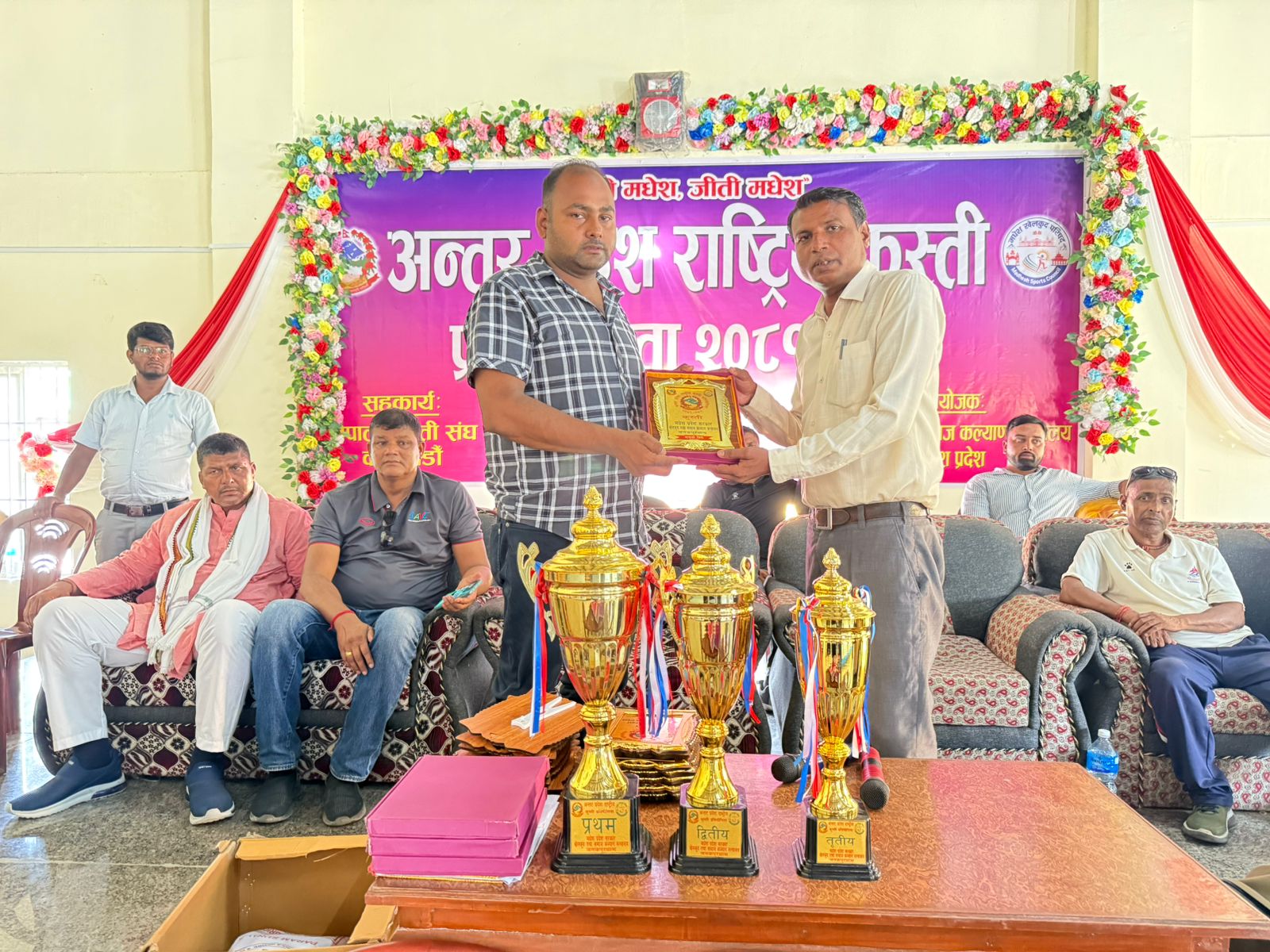 न्तर प्रदेश राष्ट्रिय कुस्ती प्रतियोगिता–२०८२ मा मधेश प्रदेश प्रथम भएको छ। मधेश प्रदेशले सर्वाधिक ८ स्वर्ण र दुई रजत पदक सहित प्रथम भएको हो। मधेश प्रदेश टोली लाई मधेश खेलकूद परिषद्का सदस्य लभ अधिकारी, भलिवलका राष्ट्रिय प्रशिक्षक भरत यादव, नेपाल कुस्ती संघ मधेश प्रदेशका अध्यक्ष रमेश साहले संयुक्त रुपमा ट्रफी प्रदान गरेका हुन् ।