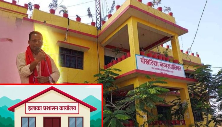 पोखरिया नगपालीकाको नगर प्रमुख प्रदुमन प्रसाद चौहानको अथक प्रयासका कारण पोखरिया नगरपालिकामा ईलाका प्रसासन कार्यालयको स्थापना हुने सुचीमा परेको छ । नगर प्रमुख चुनाव लडने वेलाम जनता सँग गरेको प्रतिबद्धता मध्ये पोखरिया स्थित केही महिना अगाडी नापी साखाको कार्यालय र मालपोत साखाको कार्यालय स्थापना गराए र हाल सालै सँघिय मामिला तथा सामान्य प्रसासन मन्त्रालयले देश भर २३ वटा ईलाका प्रसासन कार्यालय थपन लागेको सुचीमा पोखरिया नगरपालीका पनी परेको छ । यो नगर प्रमुख चौहानले गरेको जनता सँग गरेको प्रतिबद्धता पुरा हुन लागेको छ ।