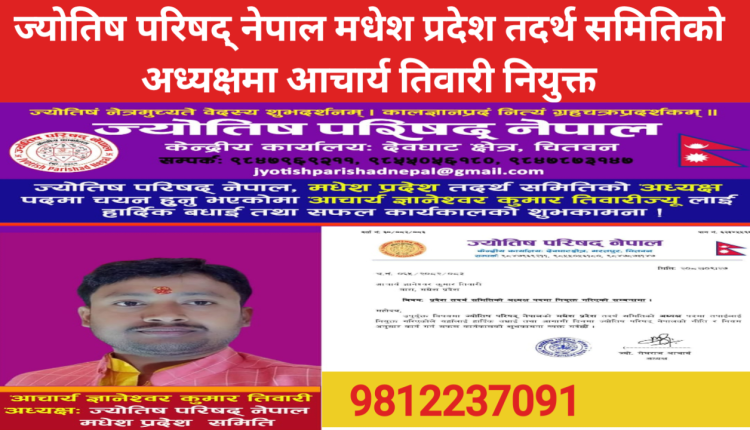 सनातन धर्मकै आधारमा यो सम्पूर्ण संसार सञ्चालन भइरहेको यथार्थलाई आत्मसात् गर्दै त्यसको संरक्षण, संवर्द्धन र प्रवर्द्धनलाई थप प्रभावकारी बनाउने उद्देश्यका साथ ज्योतिष परिषद् नेपालले मधेश प्रदेश तदर्थ समितिको अध्यक्ष पदमा आचार्य ज्ञानेश्वर कुमार तिवारीलाई चयन गरेको छ। महागढीमाई नगरपालिका २ बरियारपुर निवासी आचार्य (MA) पंडित श्री रामायण तिवारीका जेठो सुपुत्र ज्ञानेश्वर तिवारीले काशी बनारसका सम्पुर्णान्द संस्कृत युनिभर्सिटी बाट २०७५मा आचार्य(MA) उतिर्ण गरेका छन्।
