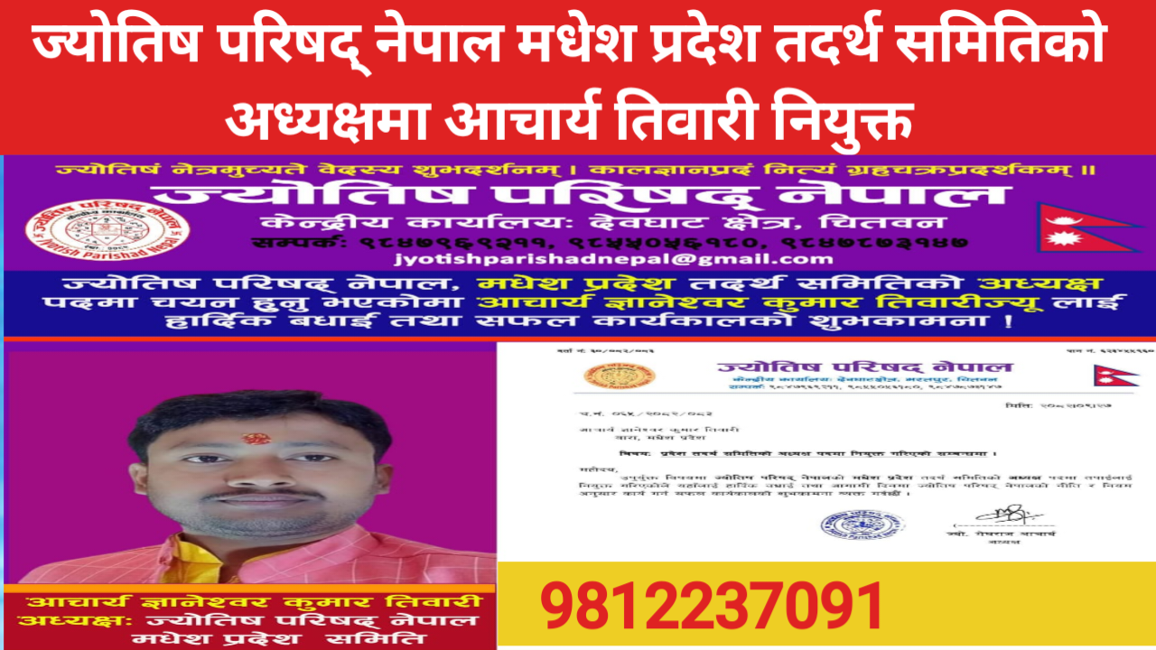 नातन धर्मकै आधारमा यो सम्पूर्ण संसार सञ्चालन भइरहेको यथार्थलाई आत्मसात् गर्दै त्यसको संरक्षण, संवर्द्धन र प्रवर्द्धनलाई थप प्रभावकारी बनाउने उद्देश्यका साथ ज्योतिष परिषद् नेपालले मधेश प्रदेश तदर्थ समितिको अध्यक्ष पदमा आचार्य ज्ञानेश्वर कुमार तिवारीलाई चयन गरेको छ। महागढीमाई नगरपालिका २ बरियारपुर निवासी आचार्य (MA) पंडित श्री रामायण तिवारीका जेठो सुपुत्र ज्ञानेश्वर तिवारीले काशी बनारसका सम्पुर्णान्द संस्कृत युनिभर्सिटी बाट २०७५मा आचार्य(MA) उतिर्ण गरेका छन्।
