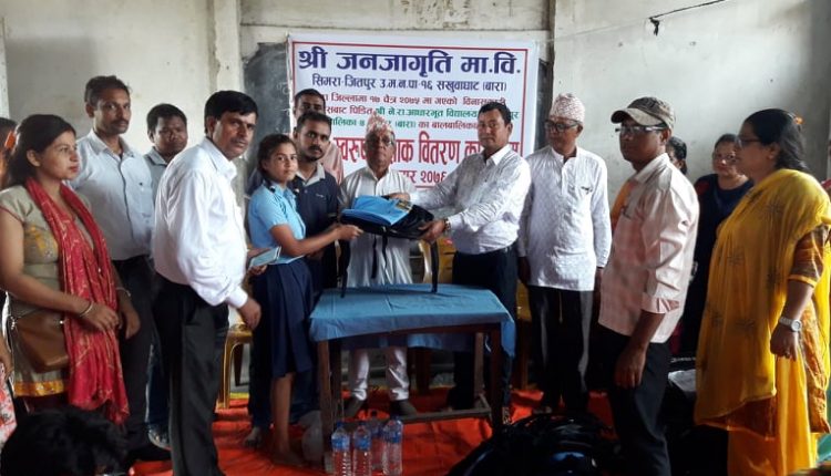हावाहुरी प्रभावित बाराको एउटा विद्यालयका विद्यार्थीहरुलाई बुधबार राहत समाग्री वितरण भएको छ । बाराको परवानीपुर गाँउपालिका वडा नम्बर ४ चैनपुरमा रहेको नेपाल राष्ट्रिय प्राथमिक विद्यालयमा विद्यार्थीहरुलाई झोला,पोशाक वितरण भएको हो । जितपुर सिमरा उपमहानगरपालिका वडा नम्बर १६ सखुवाघाटमा रहेको जन जागृति माध्यमिक विद्यालयको आर्थिक सहयोगमा दुई सय १० जना विद्यार्थीहरुलाई झोला र पोशाक वितरण भएको नेपाल राष्ट्रिय शिक्षक संगठन जितपुर सिमरा उपमहानगरपालिकाका सचिव सतेन्द्र यादवले जानकारी दिए । राहत वितरण कार्यक्रममा जन जागृत माध्यमिक विद्यालयका प्रधानाध्यापक एवं नेपाल राष्ट्रिय शिक्षक संगठन बाराका अध्यक्ष अनिल मैनाली , नेपाल राष्ट्रिय प्राथमिक विद्यालयका प्रधानाध्यापक मदन प्रसाद पटेल , विद्यालय व्यवस्थापन समितीका अध्यक्ष श्रीराम ठाकुर ,शिक्षक शिक्षिका लगायतको उपस्थिति रहेको थियो ।