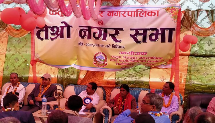 फतुवा विजयपुर नगरपालिकाको तेश्रो नगरसभा आज भव्यताका साथ सम्पन्न भएको छ । नगरपालिकाको कार्यालय फतुवा विजयपुरको सभाहलमा आयोजित एक कार्यक्रमका बीच नगरपालिकाले आफना तेश्रो नगरसभा सम्पन्न गरेको हो । मेयर र उपमेयरविच लामो समयदेखी चलिरहेको बाद विवादपछि आज रौतहटको फतुवा विजयपुर नगरपालिकाको तेश्रो नगर सभा आज मात्रै सम्पन्न भएको छ । असाढ महिनामै हुनुपर्ने नगरसभा ९ महिना ढिलो गरी विहिवार मात्रै सम्पन्न भएको छ । मेयर गोपालयादव र उपमेयर कान्ती देवी महतोवीच बजेटमा भागबण्डा नमिल्दा यस अघि दुई पटक नगरसभा भएपनि कार्यान्वयन नभई रद्द भएको थियो ।